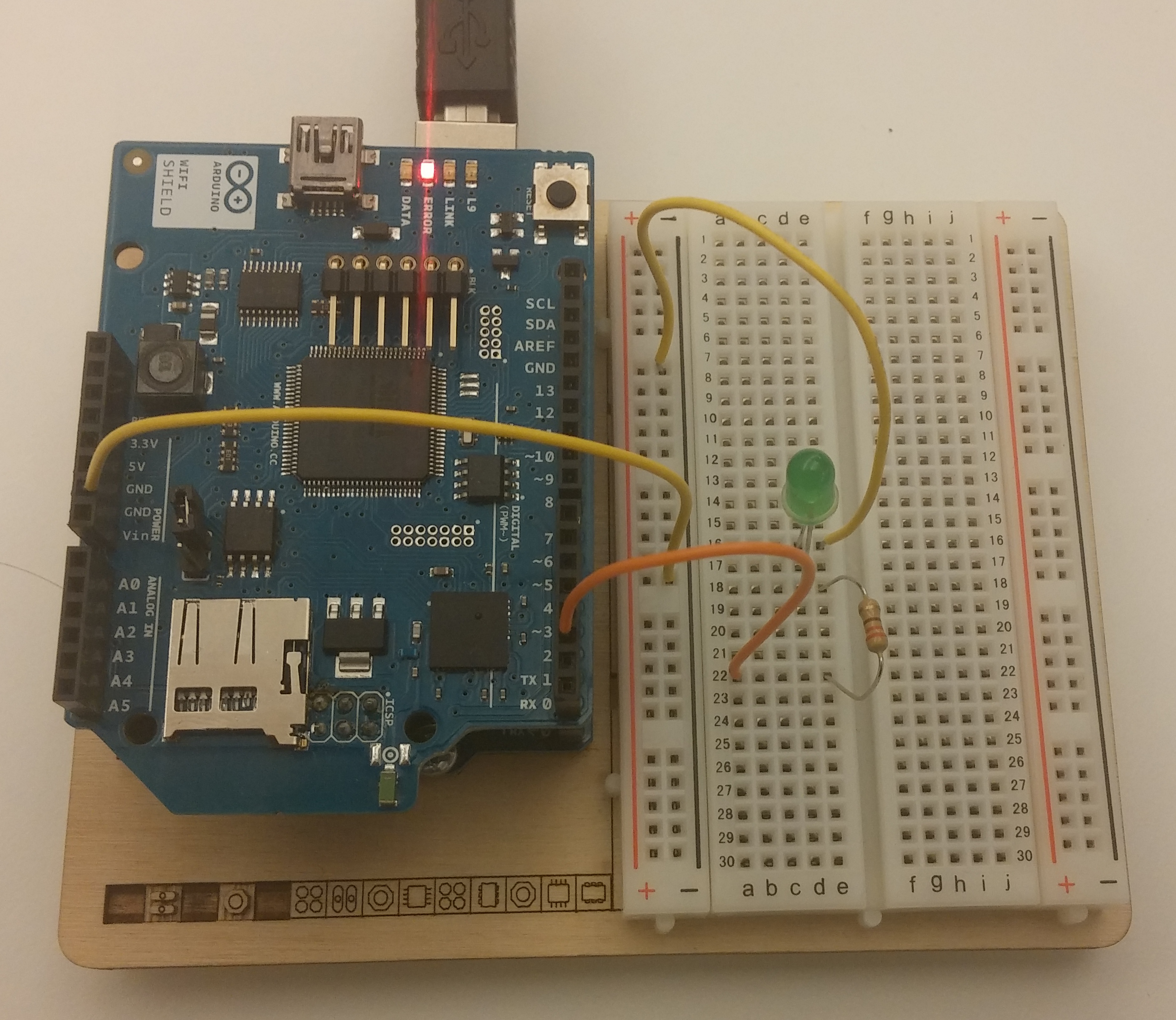 The Arduino sketch used in this example is the same as in the Arduino LED On/Off TCP Example, and files arduinotcp.js, arduinowifi.ino and arduinoethernet.ino are also the same. For clarity, the instructions from the Arduino LED On/Off Example are repeated below.
