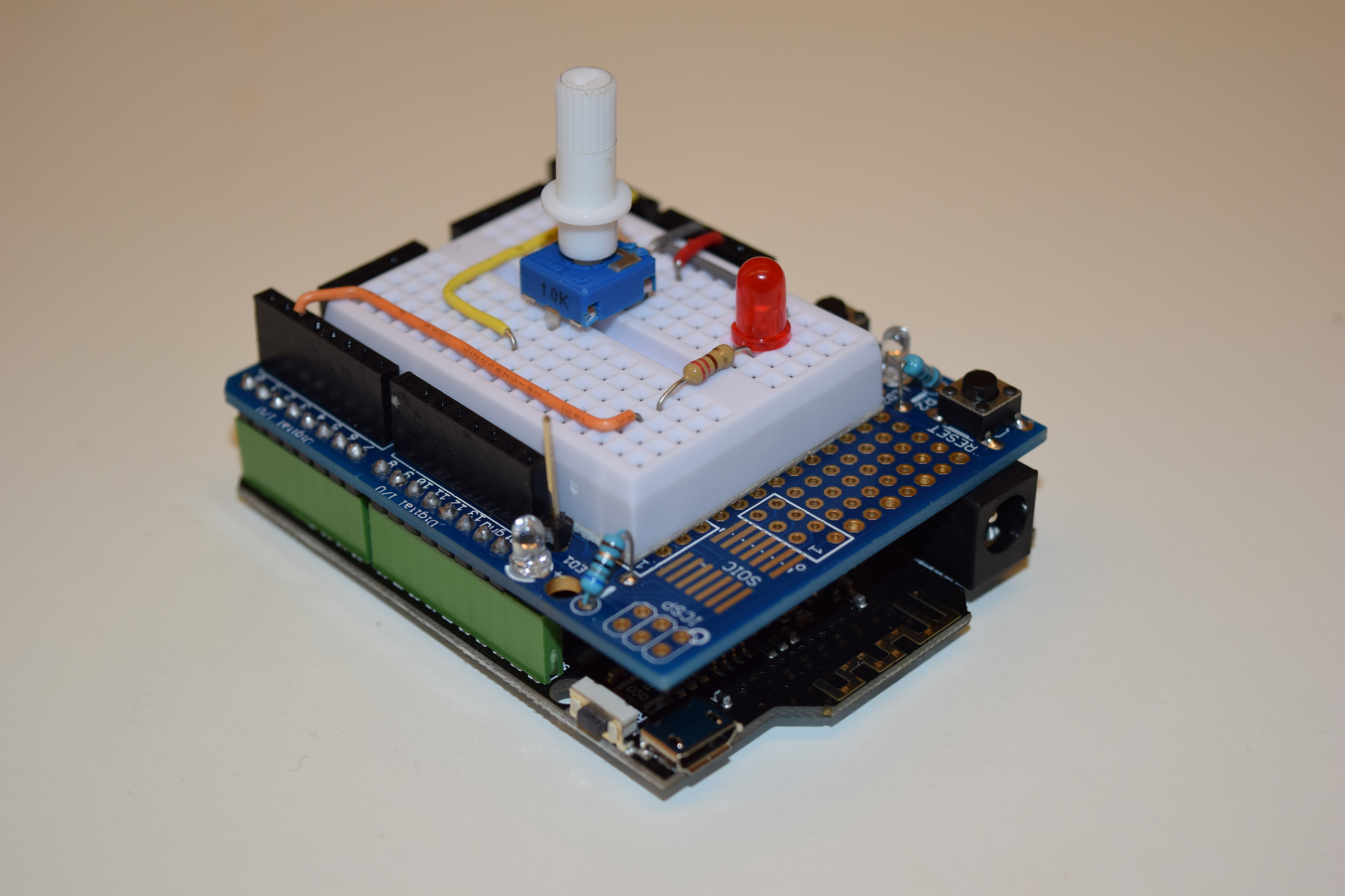 Photo of the Bluno board configured for the example:
